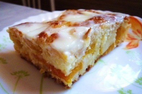 - Для крема необходимо смешать сметану с сахаром. Готовый пирог «Персиковое наслаждение» еще горячим залить получившейся сметанно-сахарной массой.