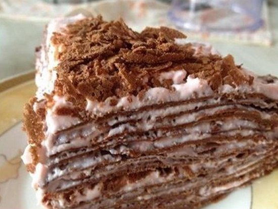 - Полученным кремом промазать готовые блины, верх украсить тертым темным шоколадом.