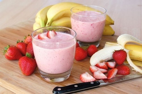 - Почистить банан, порезать на кружочки, переложить в чашку блендера. Добавить очищенную от чашелистиков клубнику (крупную порезать), сделать фруктовое пюре.
