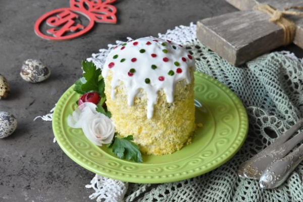 Верх салата смажьте сметаной, имитируя глазурь на пасхальном куличе. Посыпку на «глазури» можно имитировать мелкими кусочками цветных овощей.