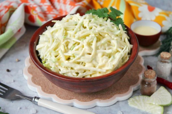 Такой салат можно сделать из черной, зеленой редьки или дайкона. Замачивание подготовленной редьки позволит смягчить ее резкий запах и острый вкус, а ошпаренный лук придаст салату сладкую нотку. Если будете брать сладкий салатный лук, то ошпаривать его не обязательно. Подавать можно сразу, но лучше, если он постоит в холодильнике 1-2 часа, чтобы редька пропиталась майонезом.