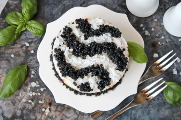 Аккуратно снимите кольцо, украсьте икрой низ салата и уберите в холодильник от 30 минут до одного часа, чтобы слои объединились.