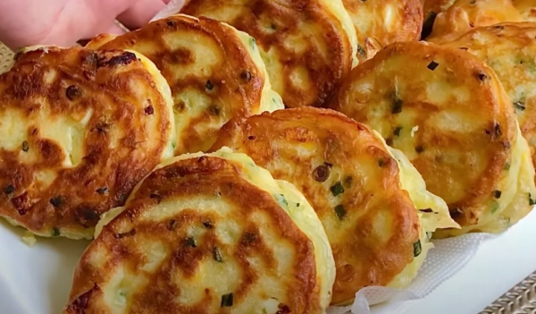 Выкладываем лук и яйца в тесто, перемешиваем. Кладем тесто в кондитерский мешок, сцеживаем небольшие лепешки на разогретую сковороду с растительным маслом.