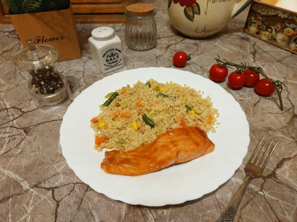 Ранее я уже показывала вам различные интересные рецепты с участием красной рыбы, например, жареной на сковороде или запеченной в духовке семги, пасты с лососем, рыбного пирога, ну и всевозможных салатов и закусок, про которые я сегодня говорить не буду, поскольку мы с вами обсуждаем горячие рыбные блюда. Большинство вышеперечисленных блюд довольно просто готовится и при этом имеет некоторые интересные особенности, поэтому вам точно стоит взять их на заметку и когда-нибудь попробовать, ну а сегодня я не собираюсь мудрить и хочу показать вам самый элементарный рецепт из филе семги, запеченной под медовой глазурью в духовке. Правда, по ходу приготовления я все-таки решила слегка усложнить свое кулинарное повествование и кроме основного рыбного блюда, являющегося главным героем данной статьи, показать вам интересный вариант гарнира, который готовится буквально за 10 минут из крупы кускус и замороженной овощной смеси. Эти два блюда отлично выступают в тандеме, но также вполне могут существовать и по отдельности, поэтому непременно попробуйте приготовить то, что приглянулось, ведь я предлагаю только проверенные и наиболее привлекательные рецепты. Попробуйте и не пожалеете!