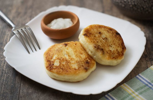 Подавать румяные аппетитные сырники с изюмом надо сразу же после приготовления, пока они пышные и воздушные, вместе со свежей сметанкой. Приятного аппетита!