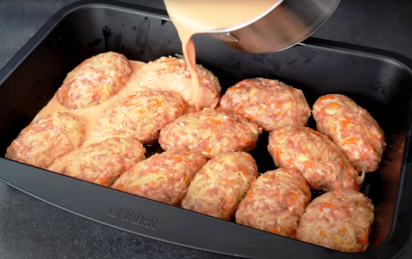 Выкладываем тефтели на форму для запекания. Смешиваем сметану с томатной пастой, солим, добавляем сахар, вливаем воду и перемешиваем.