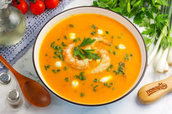 Назначение: На обед Основной ингредиент: Рыба и морепродукты / Овощи / Морепродукты / Креветки / Тыква Блюдо: Супы / Супы-пюре / Крем-суп