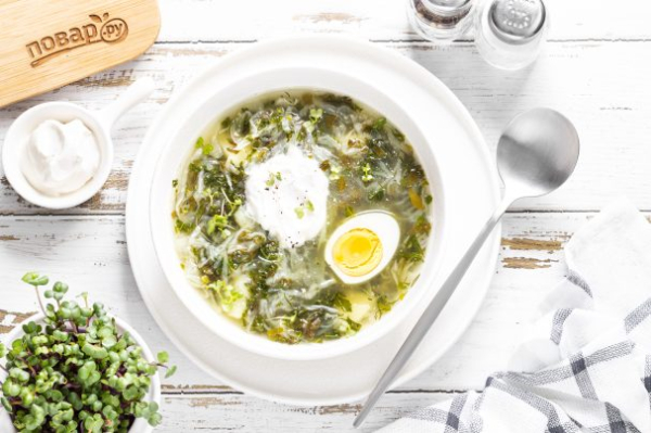Перед подачей в суп можно добавить сметану и вареное яйцо. Зеленые щи готовы, приятного вам аппетита!