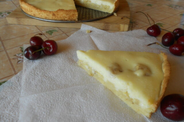 Переложить тесто в форму, сформовать бортики, уложить банан, вылить сверху яичную смесь.