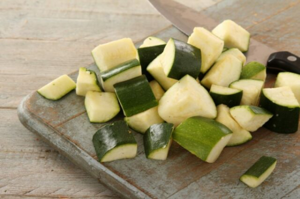 - Очистить кабачки и нарезать довольно крупными кубиками.